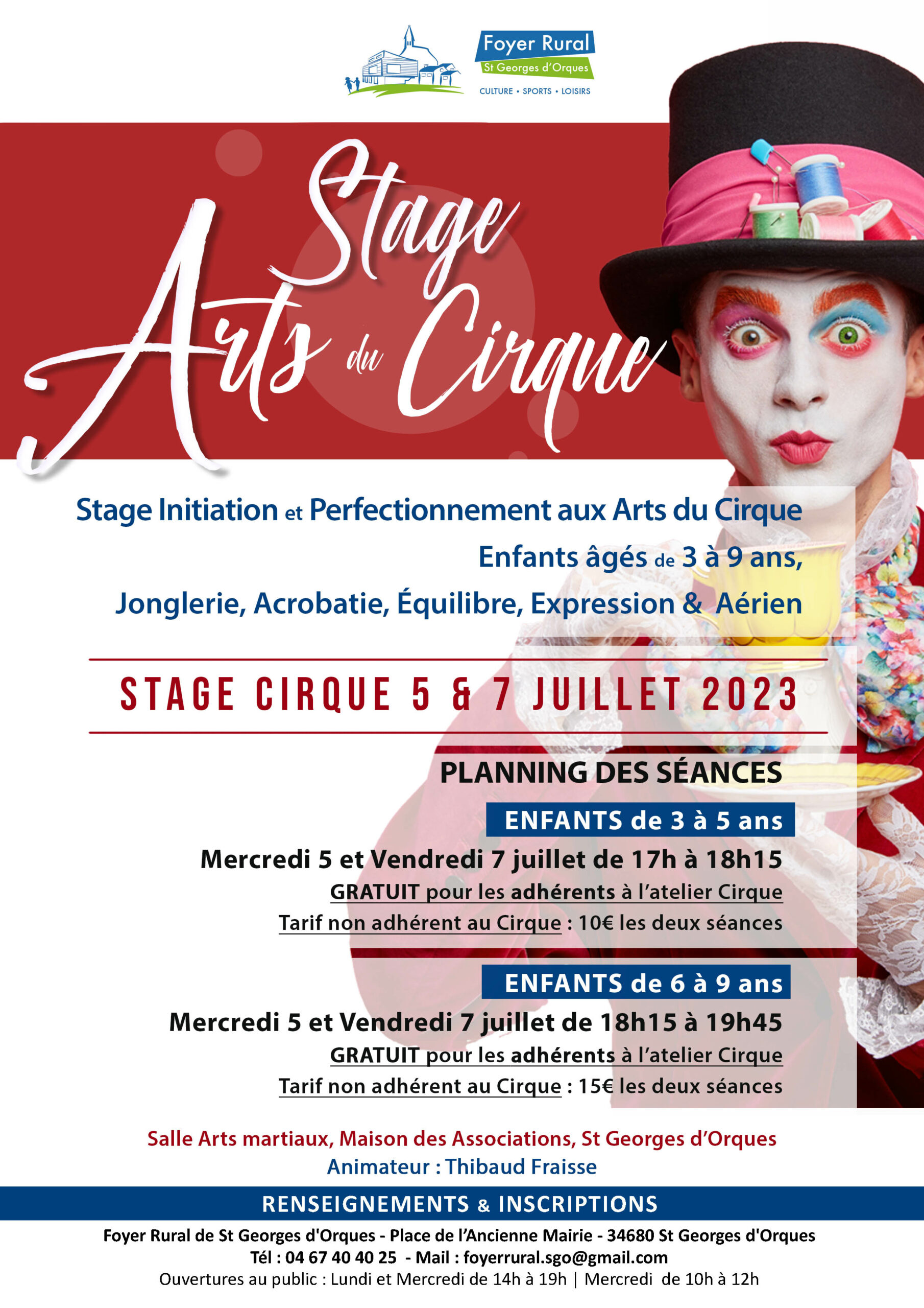 Stage Arts du Cirque 5 & 7 Juillet 2023 – Salle Arts Martiaux 14 Juin 2023 Articles similaires: Stage Arts du Cirque Arts du Cirque Assemblée Générale : Samedi 25 novembre à 10h30 – Salle Jefferson, Rue des Lavandières Stage de Danse : Un DUO de CHOC ! Stage de Tango : 21 & 22 avril 2018 Arts plastiques Stage de Hip-Hop : Samedi 18 novembre 2017 à partir de 14H Stage de Yoga : Samedi 7 Avril 2018 de 14h à 17h Stage de Sophrologie – Samedi 3 Février 2024 – 10h à 12h